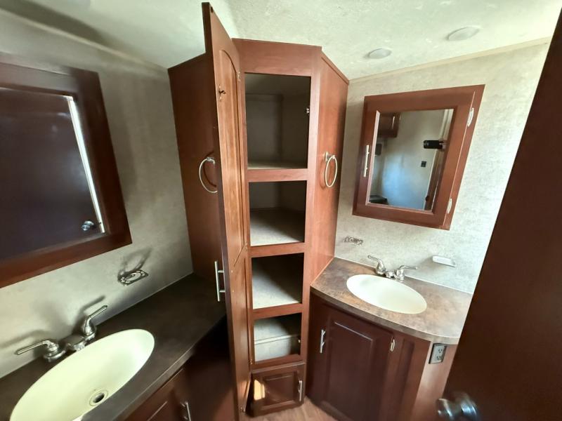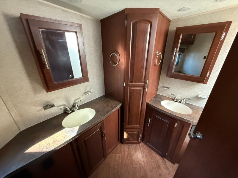 The bathroom is located in the very front of the trailer. Inside the bathroom there is a toilet, his/her sinks, medicine cabinets, linen storage, and a corner shower.
