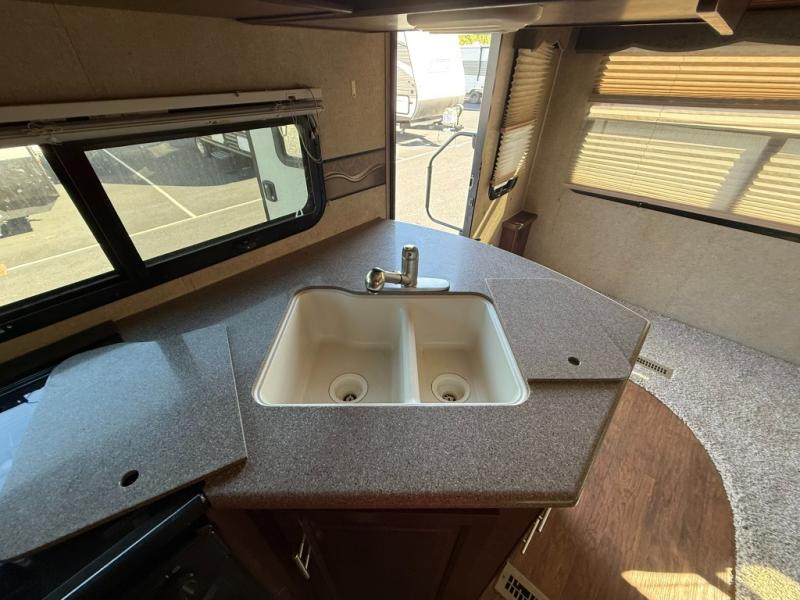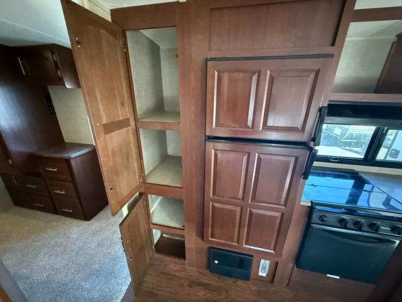 Along the curb side wall, the kitchen area has an angled countertop with a large sink, countertop extension option, overhead cabinets, three burner range, microwave, refrigerator, and a pantry for your non-perishables.