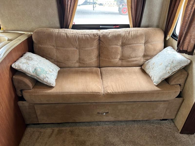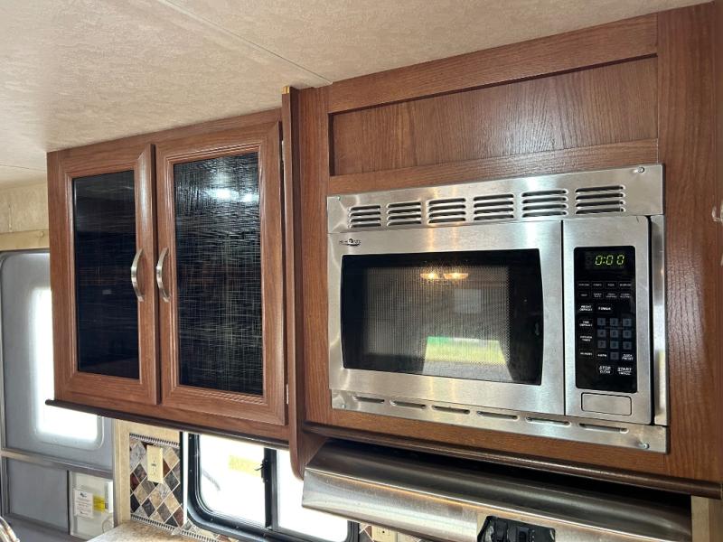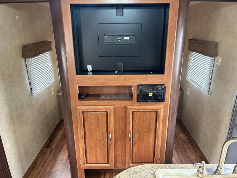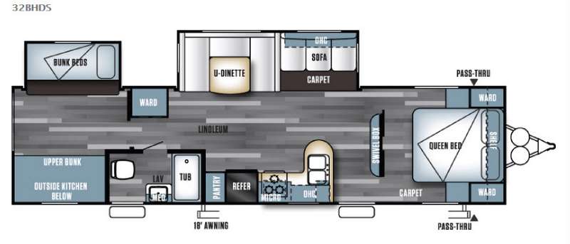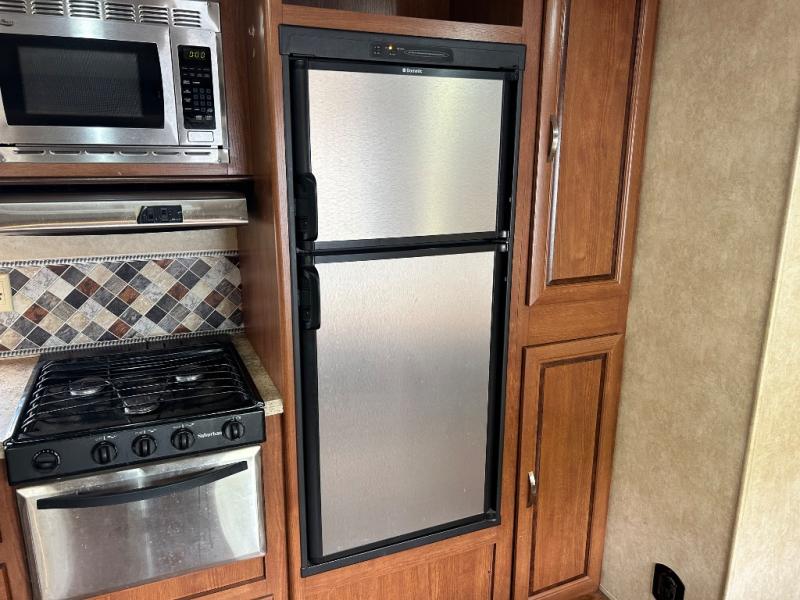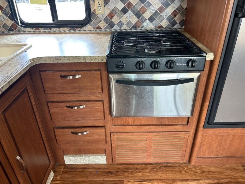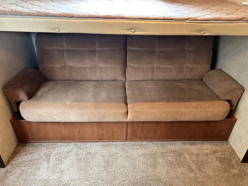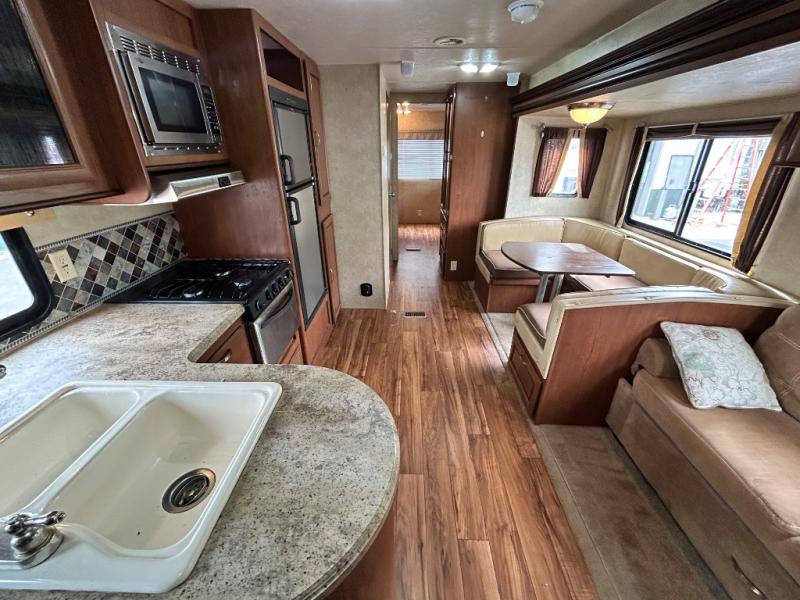 As you enter the travel trailer, to the left there is a double kitchen sink, three burner range, microwave, refrigerator, and a pantry. The opposite side of the trailer offers a slide with a sofa and a u-dinette. Next to the dinette you will find a large wardrobe. Along the front of the living/kitchen area there is a swivel box for the TV.