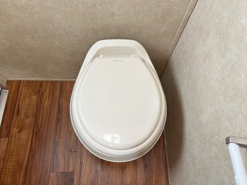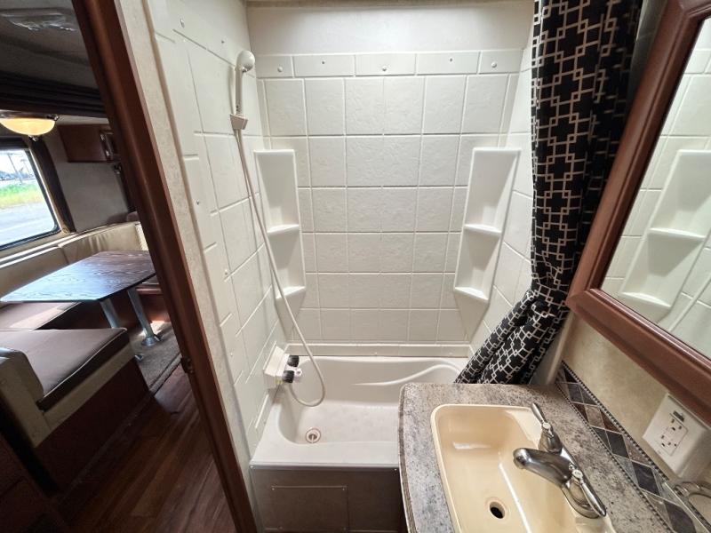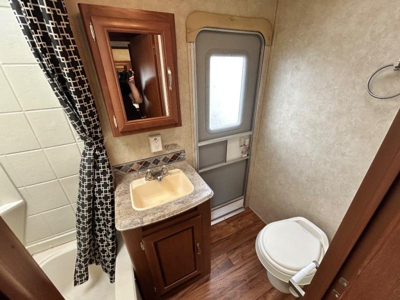 Proceeding toward the rear of the travel trailer, the bathroom is on the left. Inside the bathroom there is a tub, sink, medicine cabinet, and toilet. You will also find a private entrance outside from the bathroom.