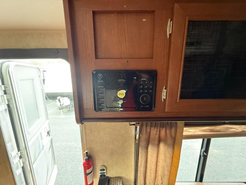 The main living area has a sofa, and on one side a dinette with TV hook-up above the dinette. The opposite side of the trailer offers a double kitchen sink, three burner range, microwave, and refrigerator.