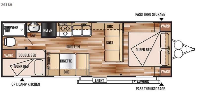There are plenty of overhead cabinets throughout the travel trailer as well as an exterior pass thru storage. You can even choose an optional outside kitchen, and much more.