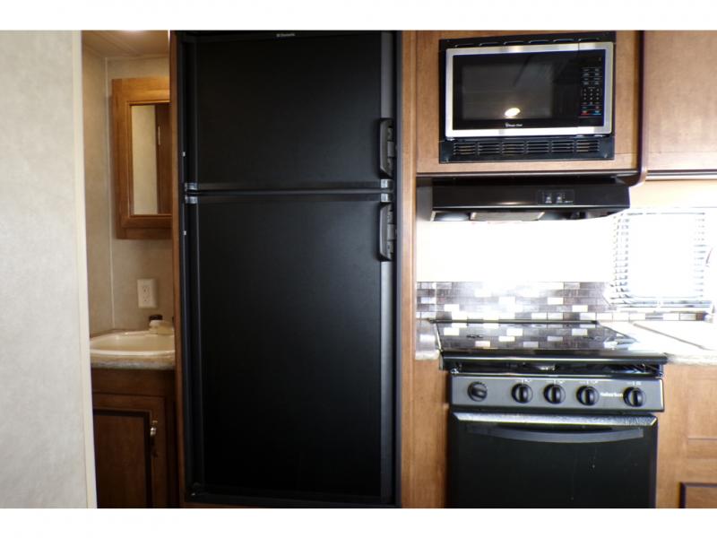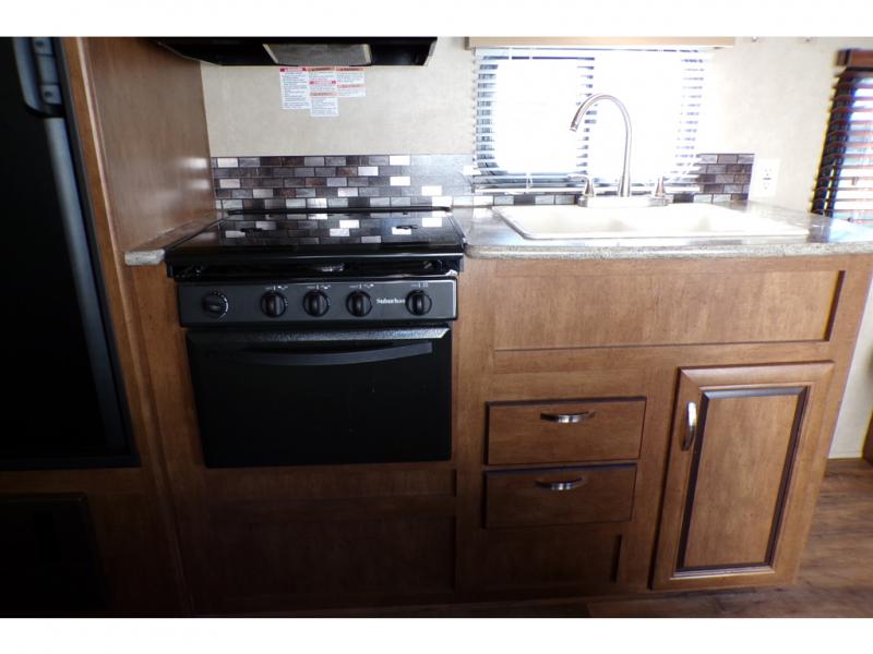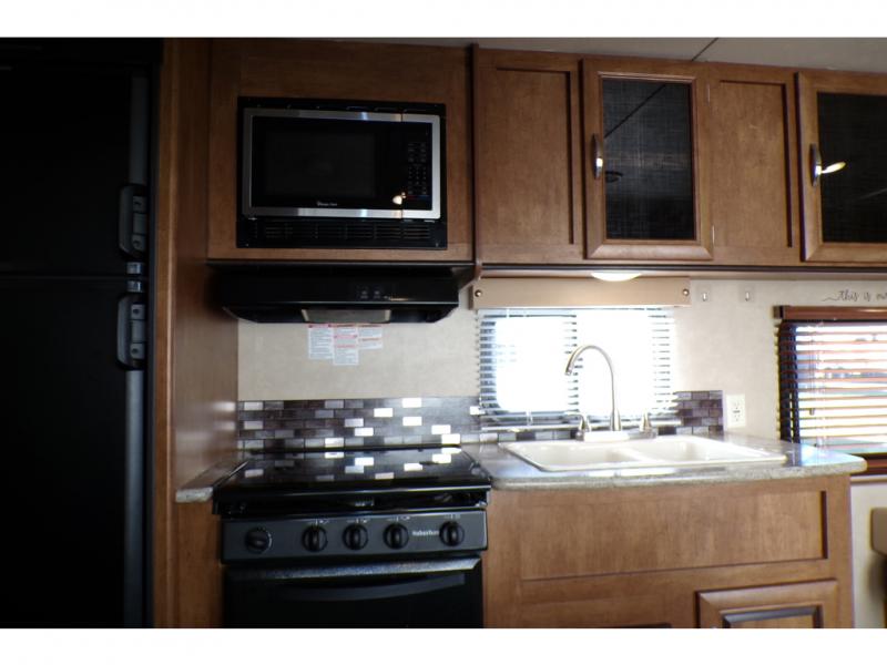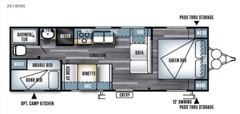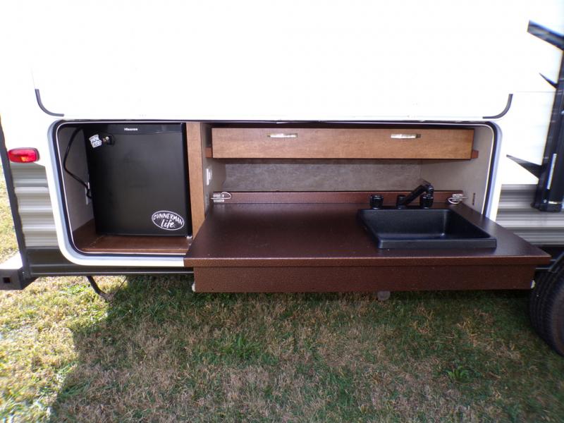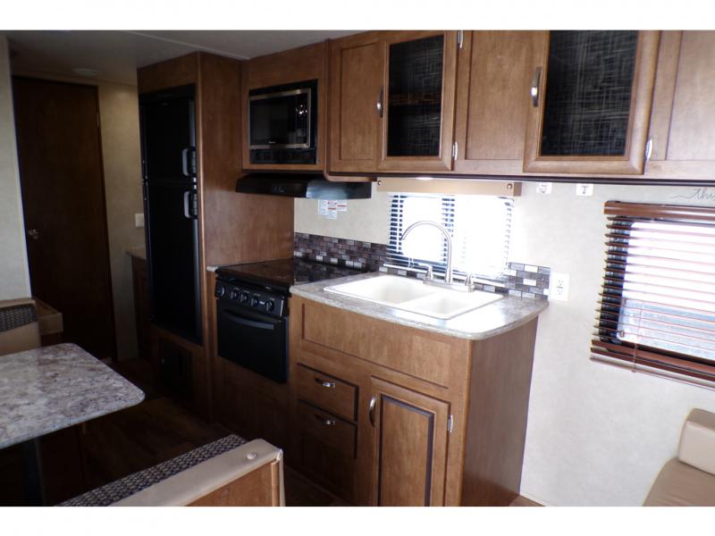 There are plenty of overhead cabinets throughout the travel trailer as well as an exterior pass thru storage. You can even choose an optional outside kitchen, and much more.