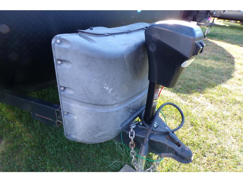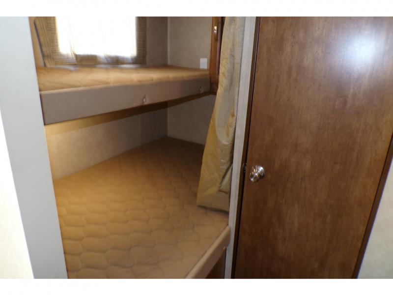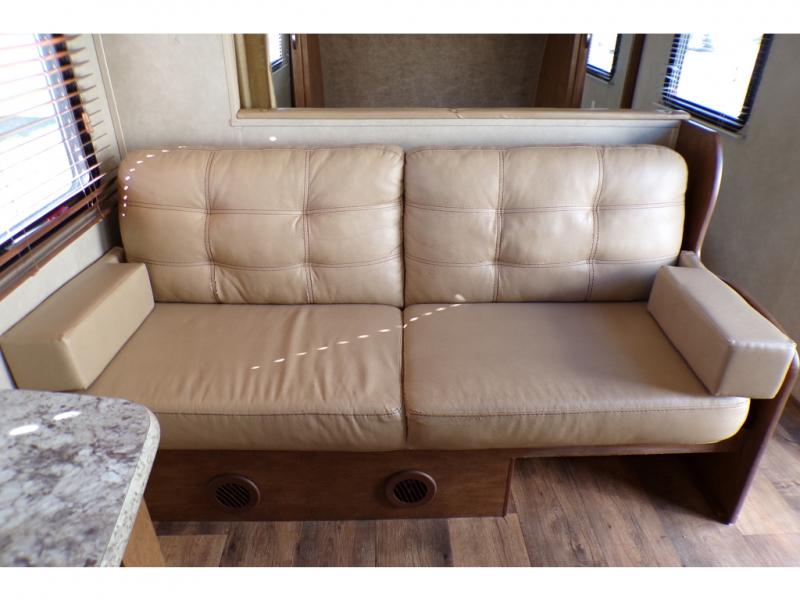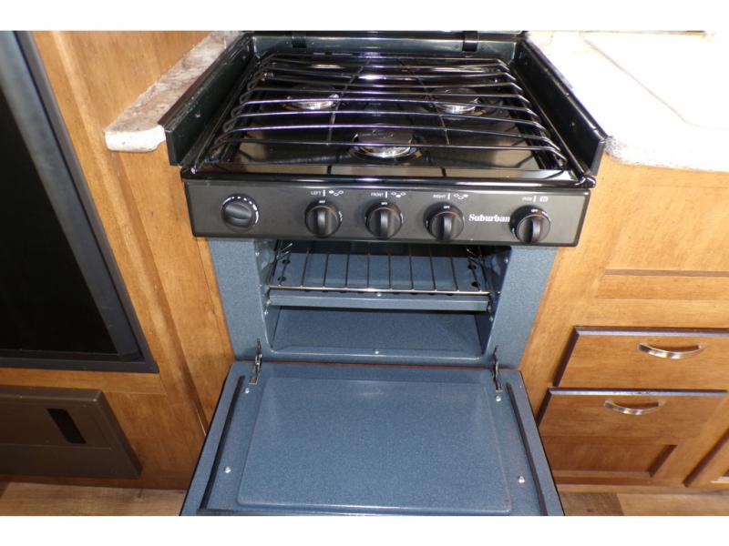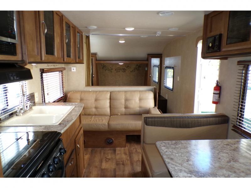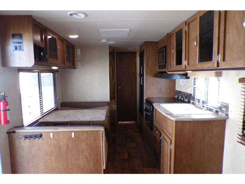 The main living area has a sofa, and on one side a dinette with TV hook-up above the dinette. The opposite side of the trailer offers a double kitchen sink, three burner range, microwave, and refrigerator.