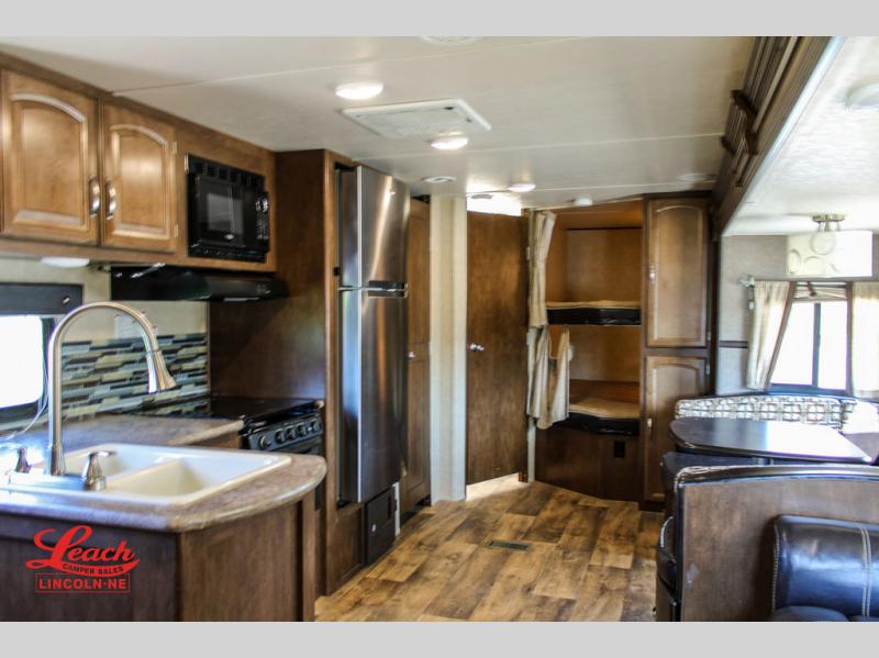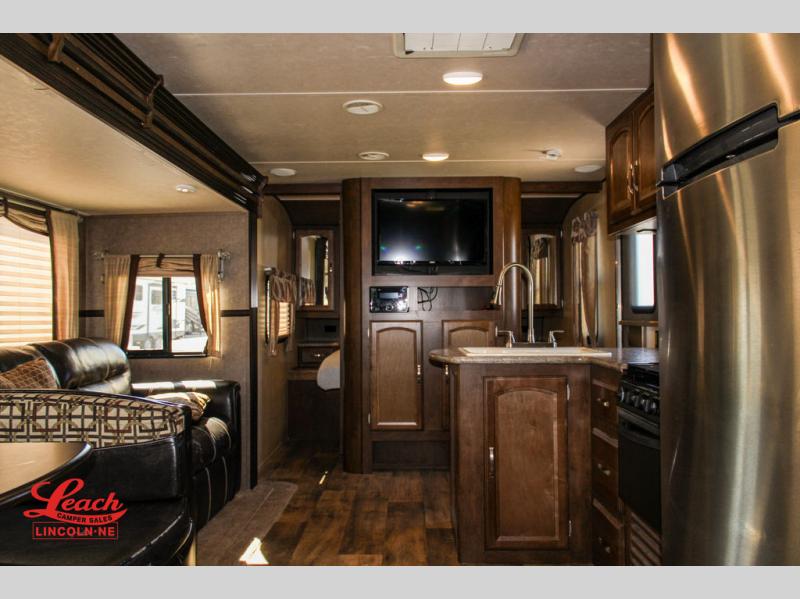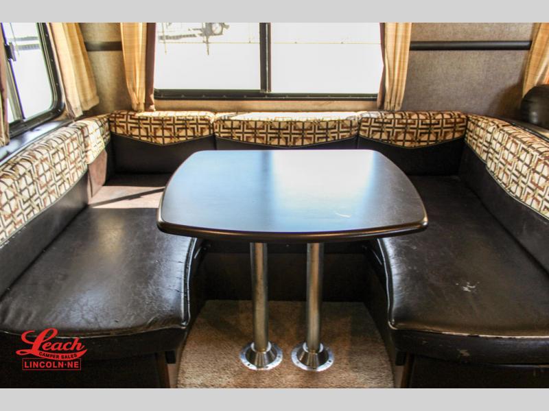 Straight in from the door along the road side you will find a slide out with a u-shaped dinette and a tri-fold sofa. This provides a great deal of seating for meals or just hanging out, and allows more foot traffic space throughout the unit.