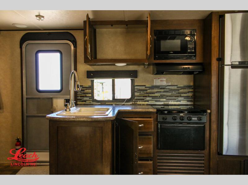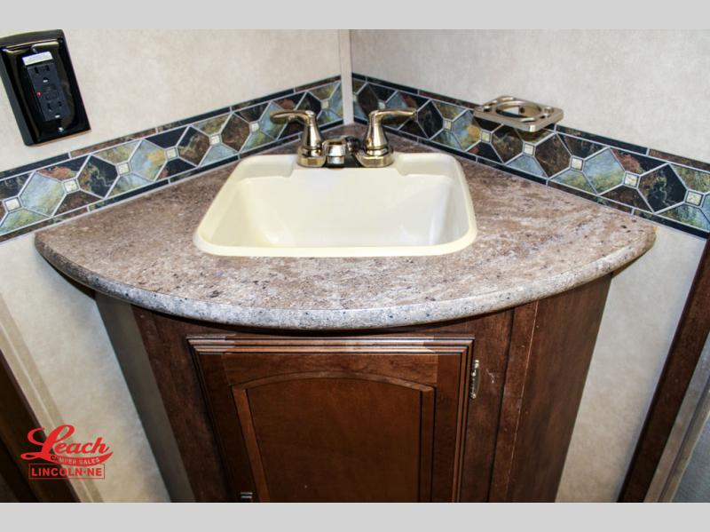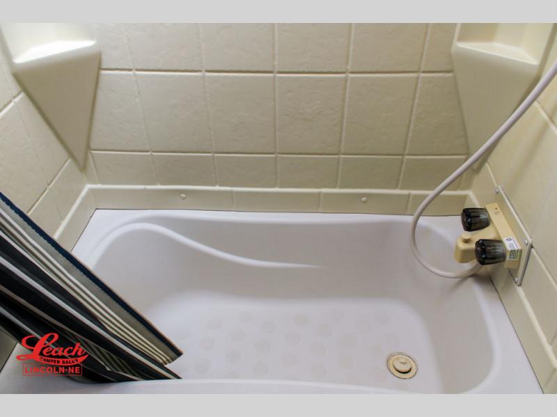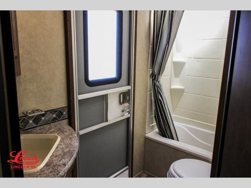 In the very rear of this Salem Hemisphere Hyper-Lyte model you can sleep four adults with the double bed bunks along the curb side. Right next door you have a convenient full bath with tub/shower, toilet, and corner vanity with sink plus overhead medicine cabinet. Also find a private entry door which leads outside from the bathroom.