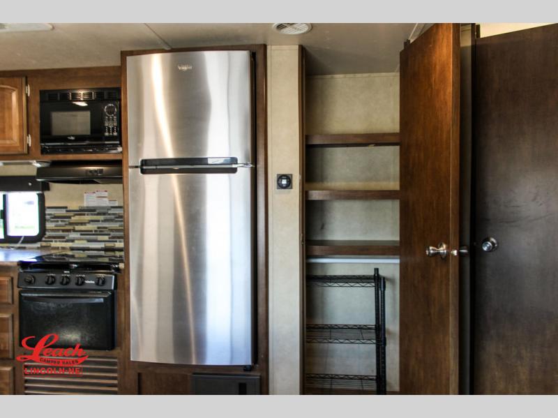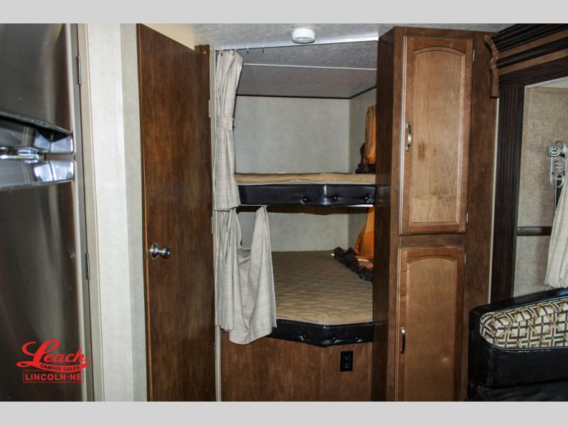 The large front pass-through storage compartment is perfect for all of your outer camping gear, and you will find more storage beneath the double bed bunks, as well as within the slide out!