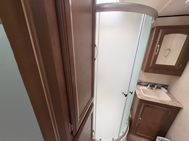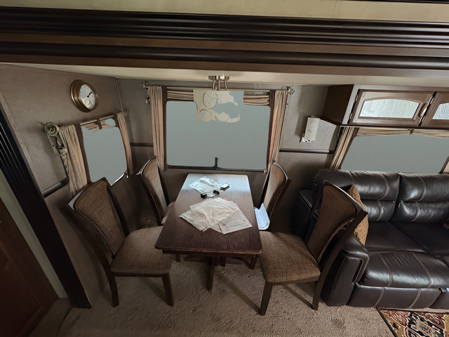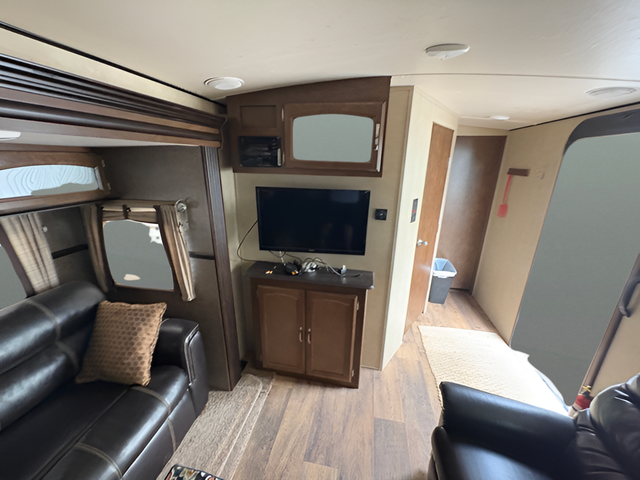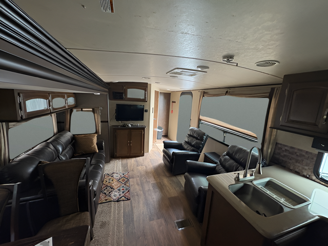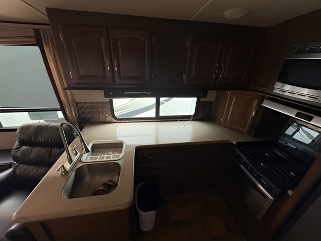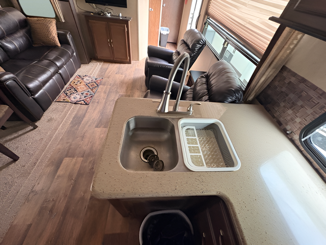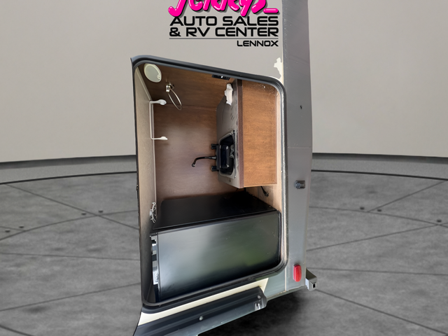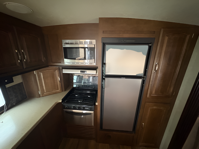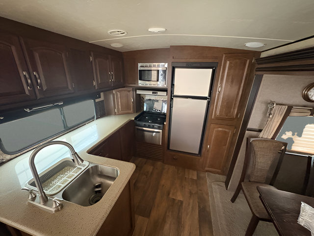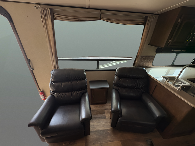 As you enter the travel trailer, to the left there are two lounge chairs and an end table. In the rear you will find a double kitchen sink, plenty of counter space, a three burner range, microwave, refrigerator, and pantry. The slide has a dinette and a hide-a-bed sofa. The entertainment center is located next to the sofa.