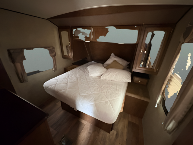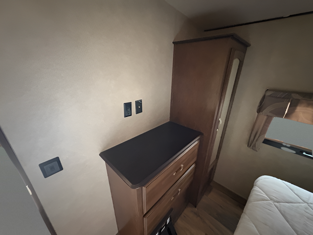 What I liked most: Master bedroom has plenty of storage with full wardrobe chest of drawers and additional closet space next to the bed. It also has nightstands with drawers. Electrical outlets on each side of the bed for digital device plug-in. Very comfortable and relaxing master bedroom area. Large living room window behind the two recliners.