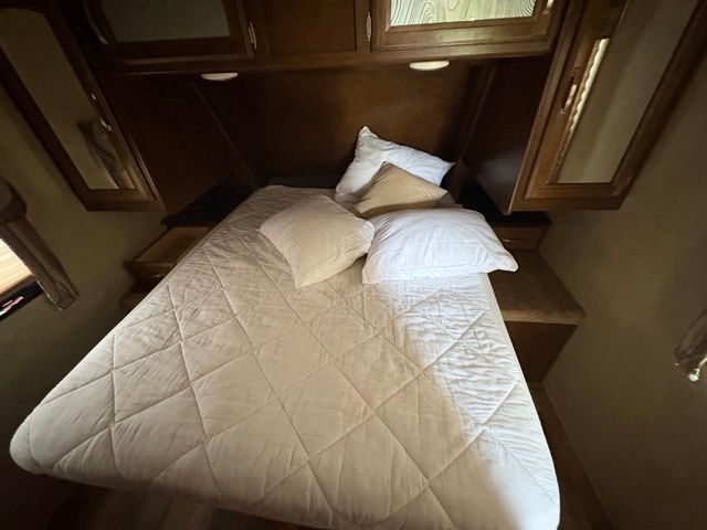 The front bedroom greets you with a queen bed and a wardrobe on one side of the bed and a nightstand on the other side of the bed. Across from the bed there is a wardrobe with TV hook-up.