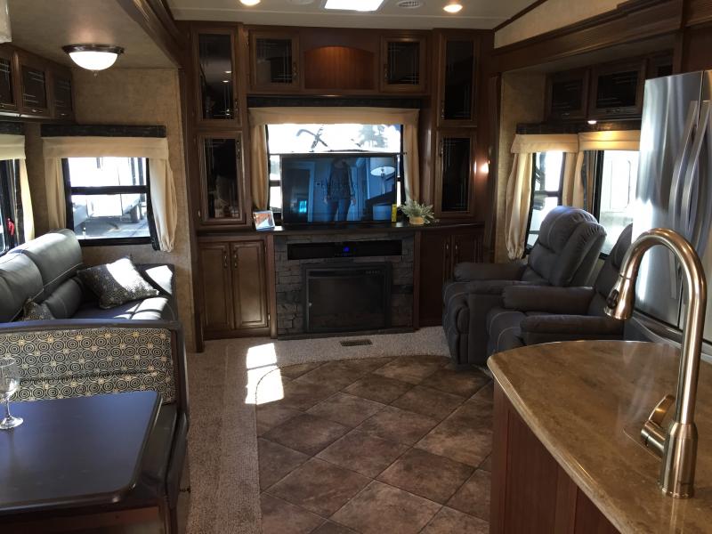 What I liked most: Beautiful rear entertainment center with cabinets all the way around, stone fireplace, and window behind TV. Double door fridge with bottom freezer in kitchen. Very private bunk area with sofa and entertainment center with storage.
