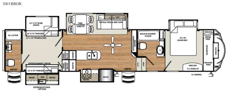 The rear of this Sierra fifth wheel features a private bunkhouse and 2nd full bath. The bunkhouse features dual opposing slides with 32" x 74" bunk beds including a third trundle bed on the right. On the left side is an entertainment center with another 32" x 74" bunk above.