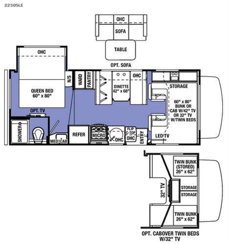 Above the cab you will find a 60" x 80" bunk with storage and a LED TV, or you can choose optional cabinets with a 42" TV or optional 32" TV with twin beds, plus more!