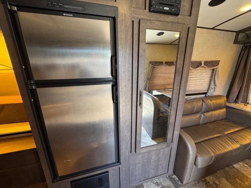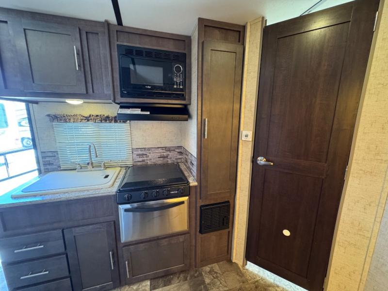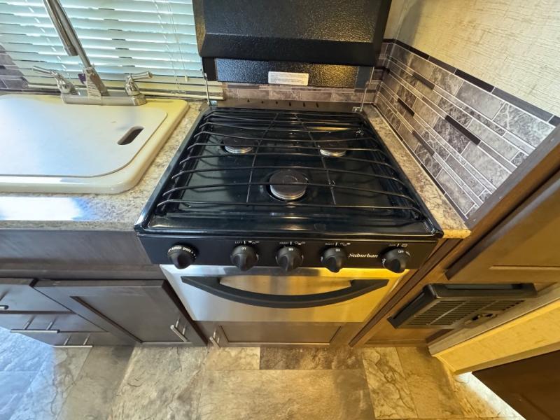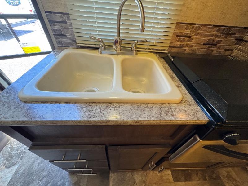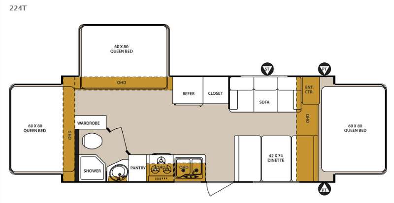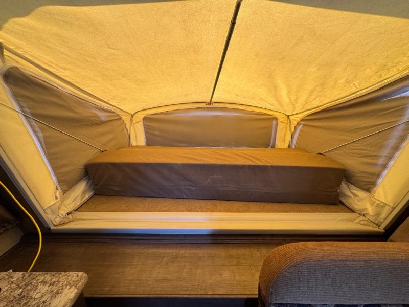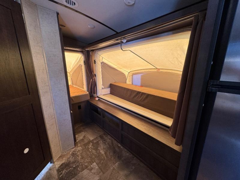 As you enter the expandable, to the left there is a double kitchen sink, three burner range, and pantry. The opposite side has a refrigerator, closet, and sofa. Across from the sofa you will find a dinette. At night the dinette easily makes into additional sleeping space. In the front corner you are sure to enjoy the entertainment center.