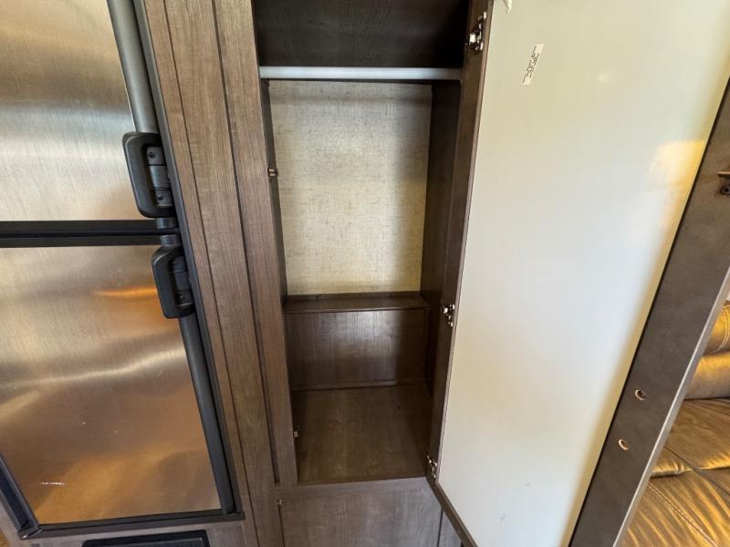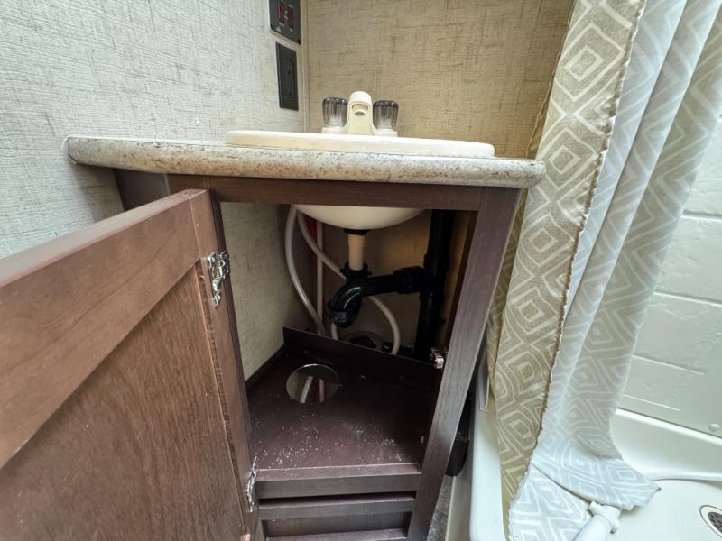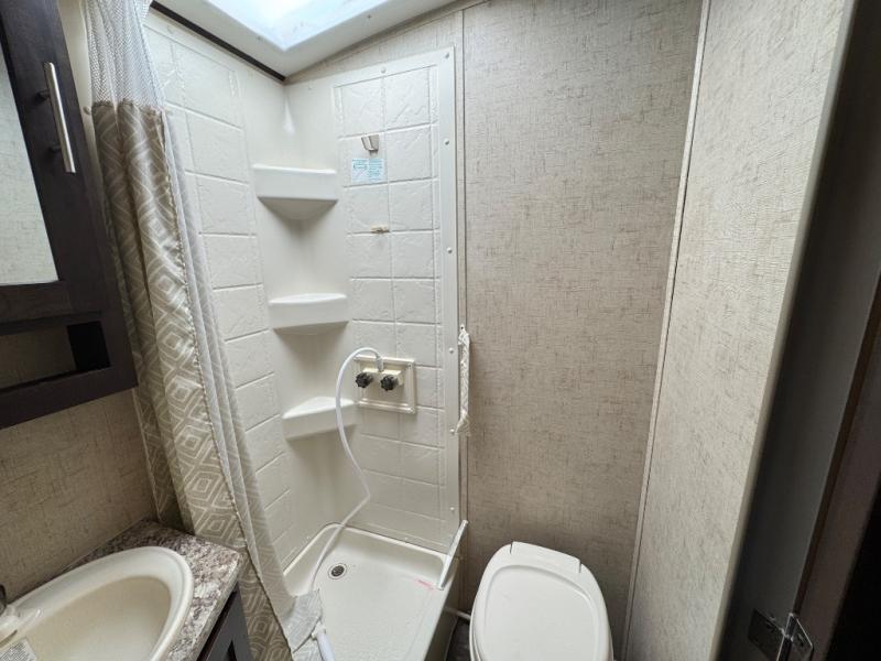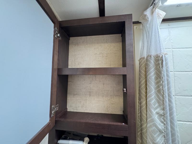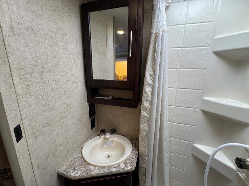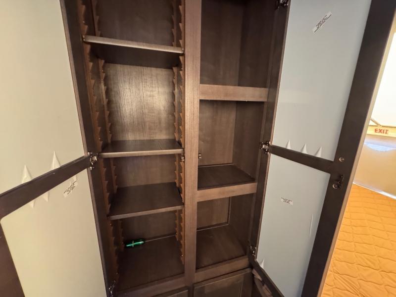 The bathroom is located in the rear of the expandable. Inside the bathroom you will find a sink, corner shower, and toilet. Just outside of the bathroom there is a nice size wardrobe which provides extra storage.