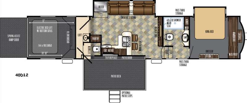 Use the spring assist rear ramp door to quickly and easily load and unload your favorite toys, stow away your gear in the overhead cabinets up front, and notice the electric bed lift with bottom sofas for seating and sleeping space once the toys are removed. There is also a loft for one extra guest in the front of the cargo area that overlooks the interior of the unit. The half bath is convenient providing a private toilet area with separate sink just around the corner. You will also like the side entry door into the cargo bay for easy access once the rear ramp door is closed, and the access through the half bath onto the side patio deck.
