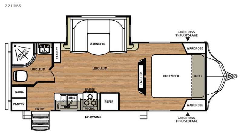 Outside find an 18' awning and a large pass thru storage area for all of your exterior camping gear, and more!