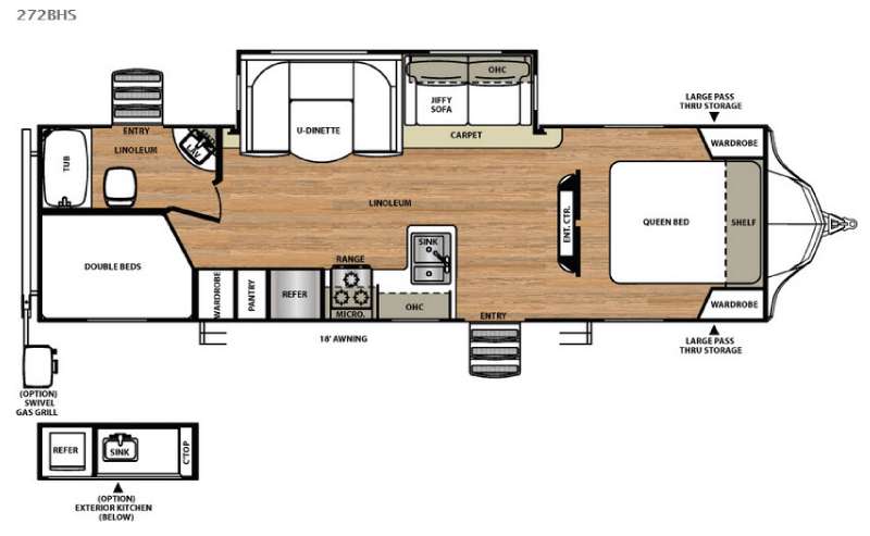 As you enter the travel trailer, to the left there is a double kitchen sink, three burner range, microwave, refrigerator, pantry, and wardrobe. On the opposite side of the trailer you will find a slide with a u-dinette and a jiffy sofa. Along the front of the living area you will enjoy the entertainment center.