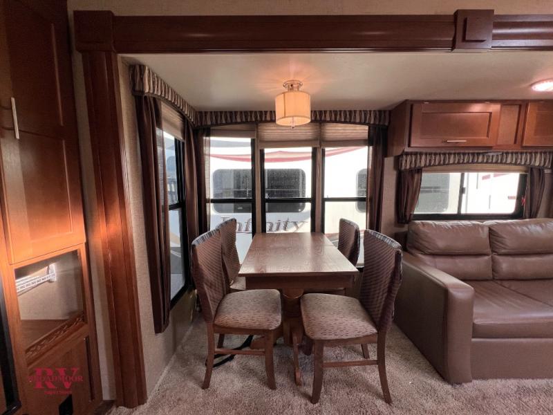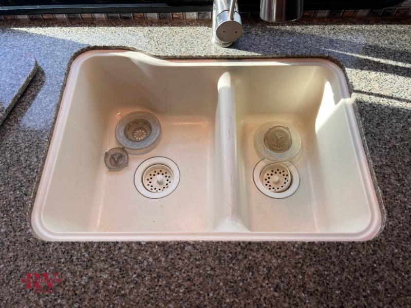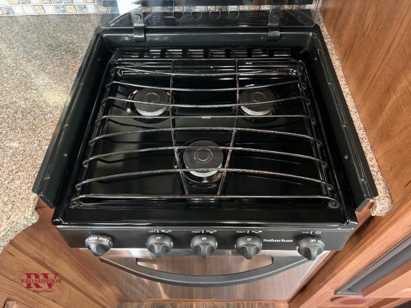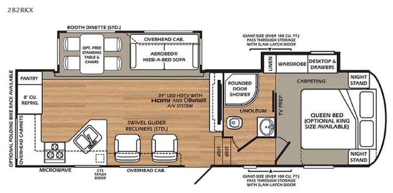 Stepping inside the 282RKX Wildcat by Forest River you will notice that the living and kitchen areas are combined. To your left of the entrance are two swivel recliners. Proceeding around the model you enter the kitchen which has a double kitchen sink on an angle, three burner range, a long counter, refrigerator, and pantry. A booth dinette and air mattress hide-a-bed sofa are located in a slide. You can easily view the 39" LED from either the kitchen or living area on this fifth wheel.