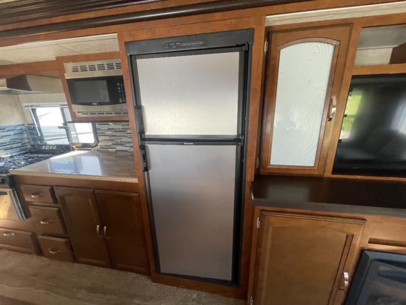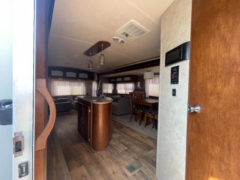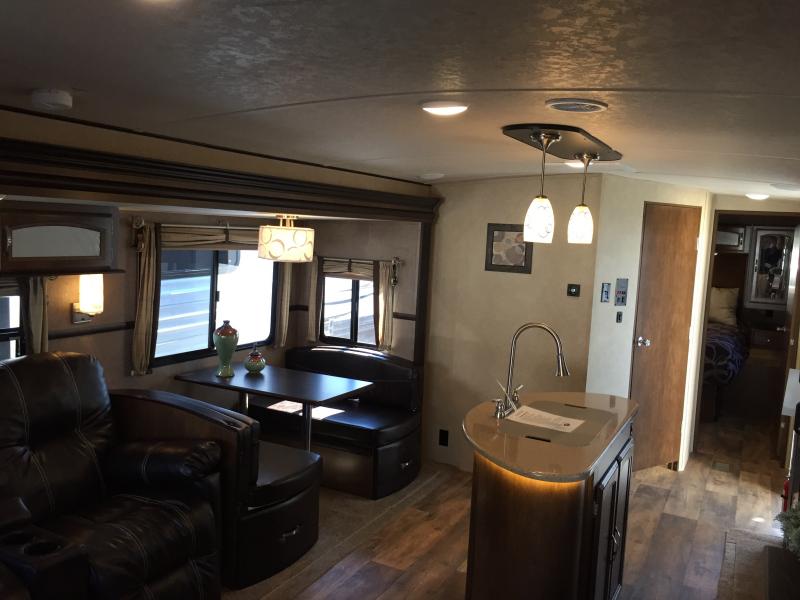 As you enter the travel trailer, to the left is a large slide with a three burner range, microwave, lots of counter space, pantry, refrigerator, and entertainment center. Along the rear wall is a tri-fold sofa. The other slide has theater seating and a dinette. You will also find a kitchen island with the double kitchen sink.