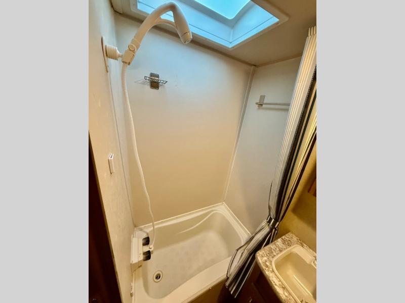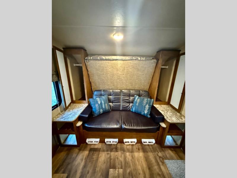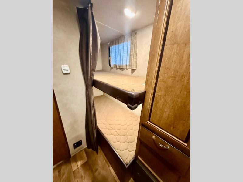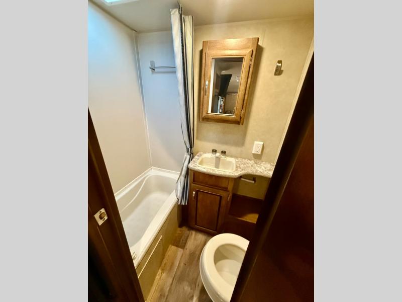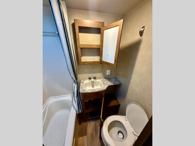 In the rear of this Wildwood unit you will enjoy a set of bunks for the kiddos, and on the opposite side there is a complete bath with toilet, tub/shower, and vanity with sink, plus medicine cabinet.