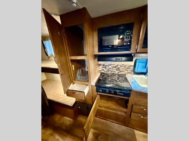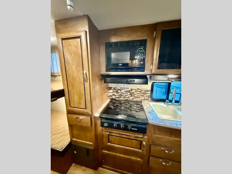 To the left find a booth dinette with overhead cabinet and TV. Along the opposite side is the kitchen which features a double sink, a three burner range with overhead microwave oven, and food pantry. The refrigerator is along the door side just beyond the dinette seating.