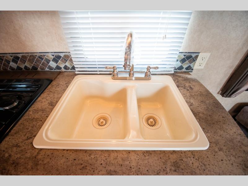 Entering the travel trailer, and find to the left that there is a dinette with TV hook-up above. Enjoy your meals at the dinette, and at night you can convert this area into additional sleeping space. The opposite side of the travel trailer has a double kitchen sink, three burner range, microwave, and refrigerator. Straight in from the entry door is a comfortable sofa.