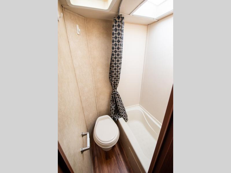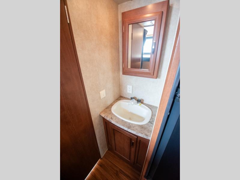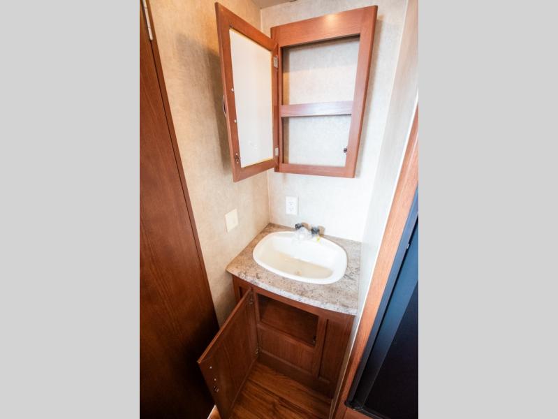 On the opposite side of the bunks is where you will find the bathroom. In the bathroom area there is a toilet and a shower/tub. Just outside of the bathroom there is a sink and medicine cabinet.
