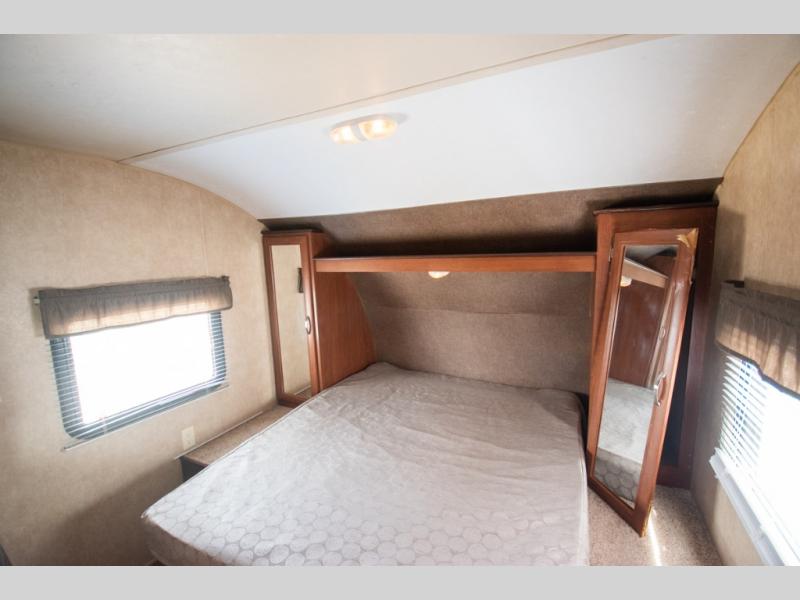 Proceeding toward the front of the travel trailer, you will come to the front bedroom. Enjoy a good nights rest on the comfortable queen bed. You can store your clothes in the wardrobes.