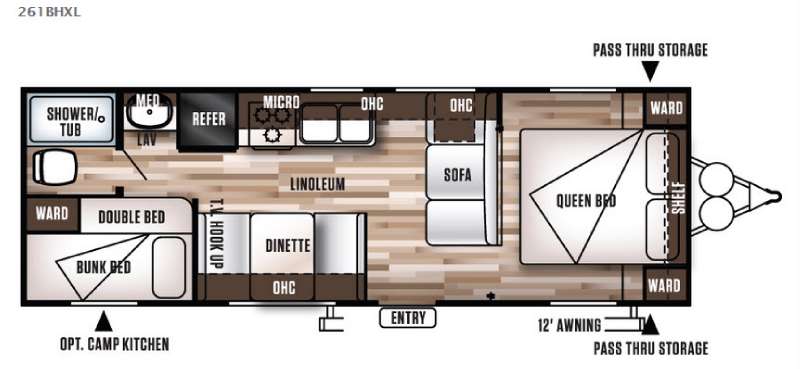 You will also be amazed at all of the interior storage as well as the exterior pass thru storage where you can stow all of your extra camping gear. The optional camp kitchen allows you to spend more time outdoors while fixing your meals. With the 12' awning you can sit and visit with friends just a little bit longer, while staying protected from the sun, and more!