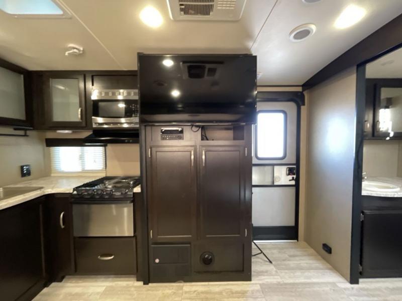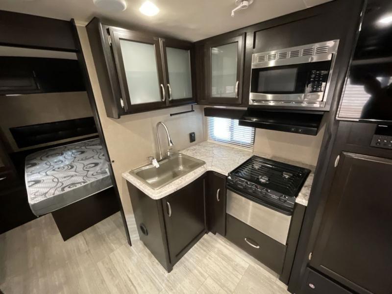 To the left of the main entry find a wardrobe and pantry with 32" LED TV above. These both lead into the kitchen area along the curb side of the unit. You can cook easily using the three burner range with overhead microwave oven, counter space, and a large single sink. There are also ample overhead cabinets for your dishes and other kitchen items. And, you will love all of the natural light streaming in through the skylight above in this area.