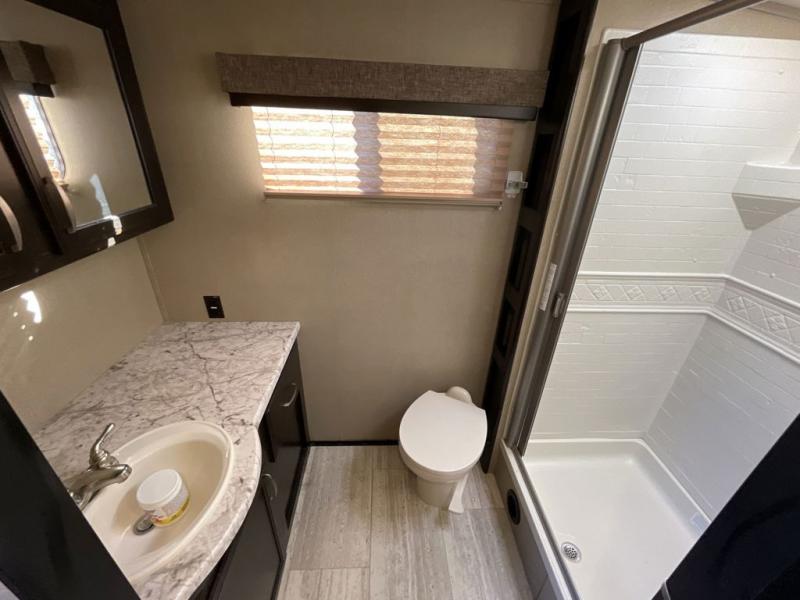 Step inside near the rear and notice the complete bath on your left with a space saving sliding door. Inside enjoy the convenience of a 30" x 36" shower including a skylight, a linen cabinet, toilet, and vanity with sink, plus overhead storage.