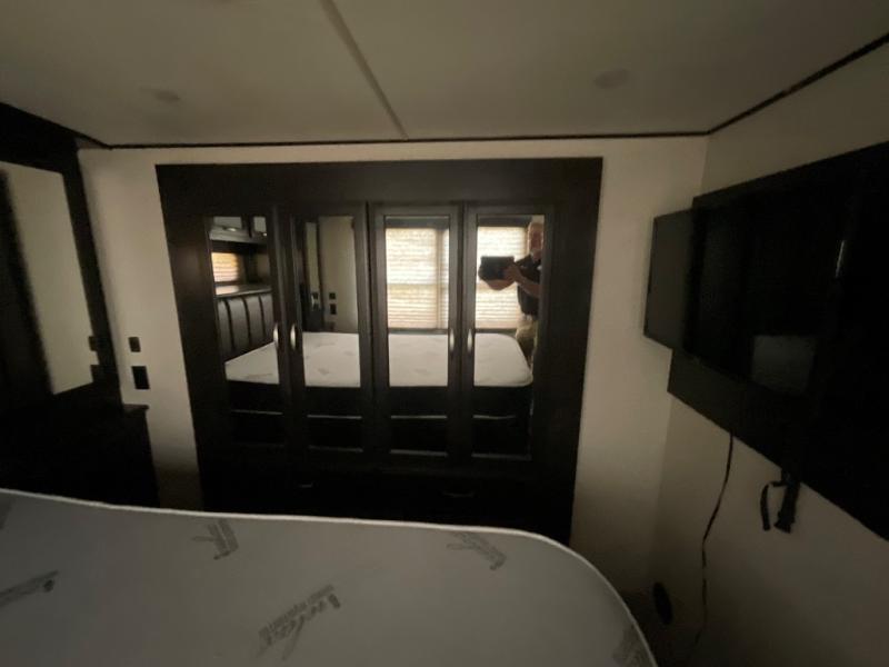 Up above the garage space you will find a master bedroom where you can rest up after a fun filled day. Enjoy a great night's sleep on a queen size bed with nightstands on either side, plus overhead cabinets. You will find plenty of storage space for your clothing in the slide out with dual closets along the road side, plus there is also an in-wall TV for your enjoyment.