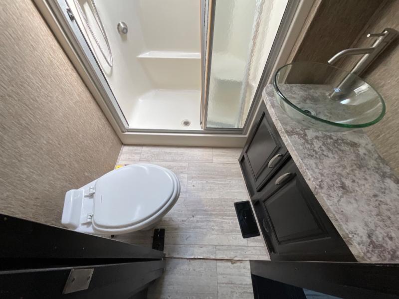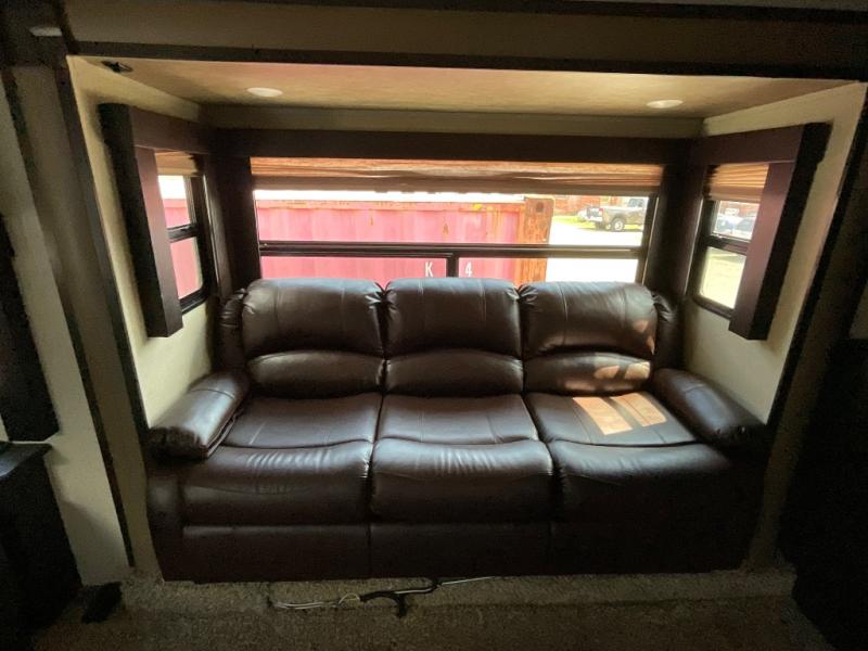 Head up the steps to the raised front living and entertainment area. There is a theater seat for two along the inside wall, or you can choose optional lounge chairs instead. Both slides in front feature an 80" tri-fold sofa/bed which allows for plenty of seating during daytime hours and sleeping when you entertain overnight guests. The front wall offers a 50" LED TV with fireplace making this a great space to enjoy the company of your family and friends!