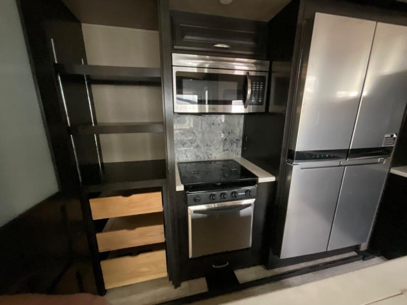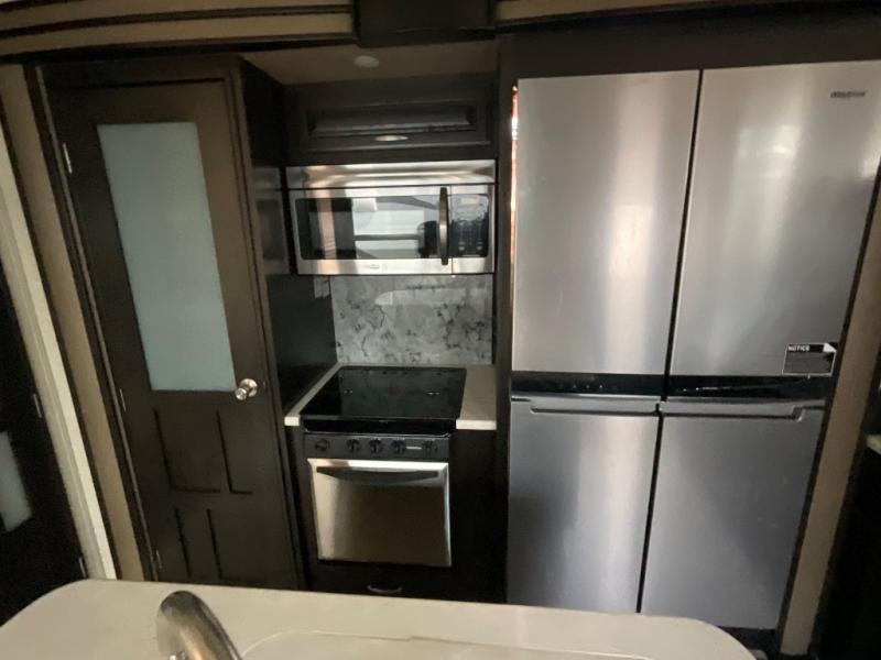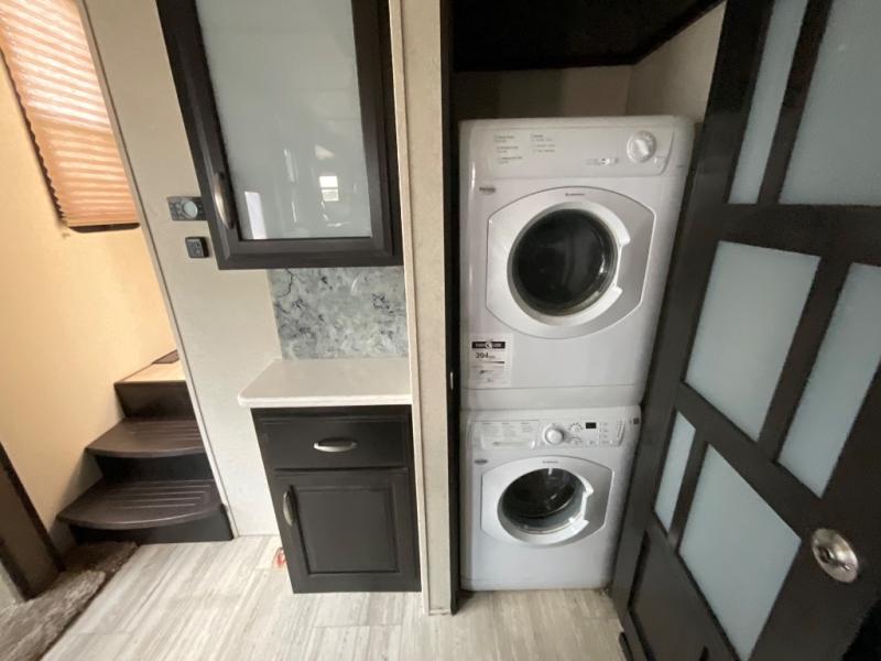 Step down just outside the bathroom into a spacious kitchen and dining area featuring dual opposing slides. There is a free standing dinette found in the curb side slide out. Opposite a second slide features a pantry, a three burner range with overhead microwave oven, and an 18 cu. ft. refrigerator. Adjacent to the pantry find a space that has been prepped for a washer and dryer if you choose to add the appliances. More counter space and overhead storage is located along the interior wall just inside the main side entry door. A convenient kitchen island also features a double sink for cleaning up, and more.