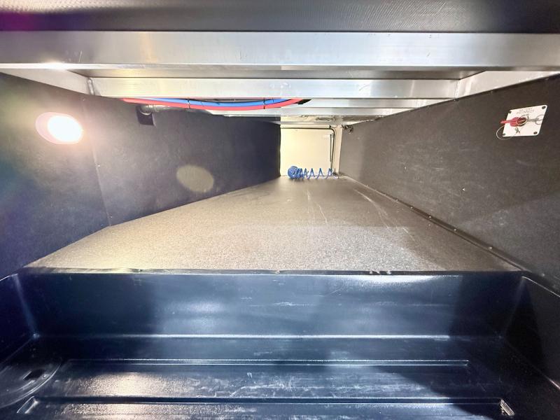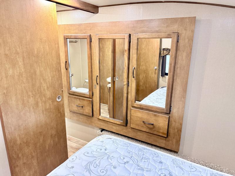 The private front bedroom can be entered from the hallway door, or through the sliding door in the bathroom. In the bedroom find a queen bed with overhead cabinets, bedside nightstands, and a slide out double wardrobe that also contains the bathroom linen cabinet, plus so much more!