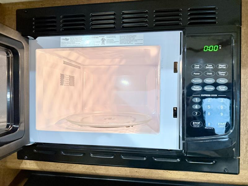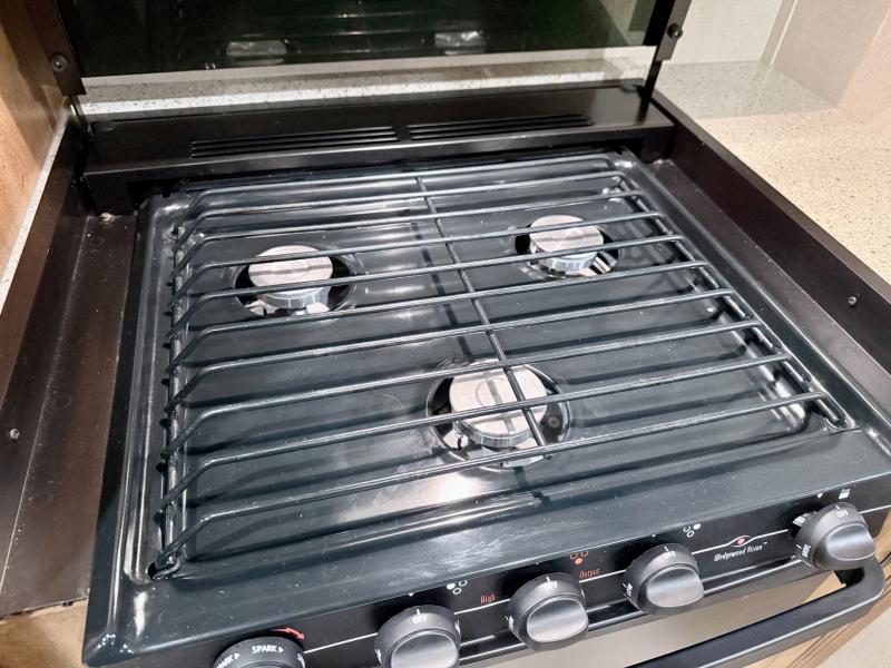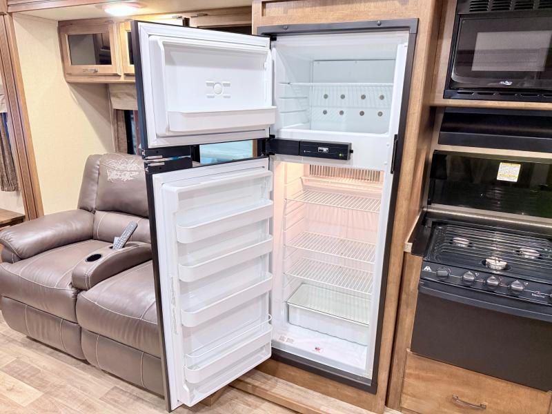 The slide opposite the door side features even more seating with theater seats for two including cup holders and overhead cabinets for your things. There is also a refrigerator, and three burner range with microwave oven within the slide out too. Along the interior living area wall find a counter-top with a sink, overhead storage, plus lower cupboards and drawer space for dishes and things.