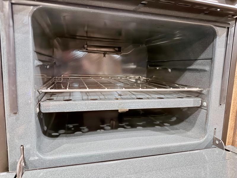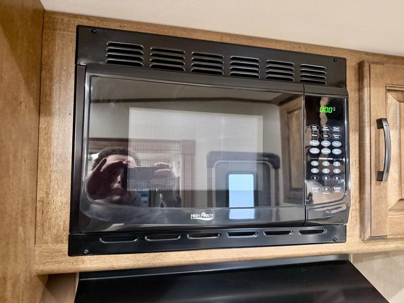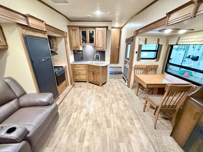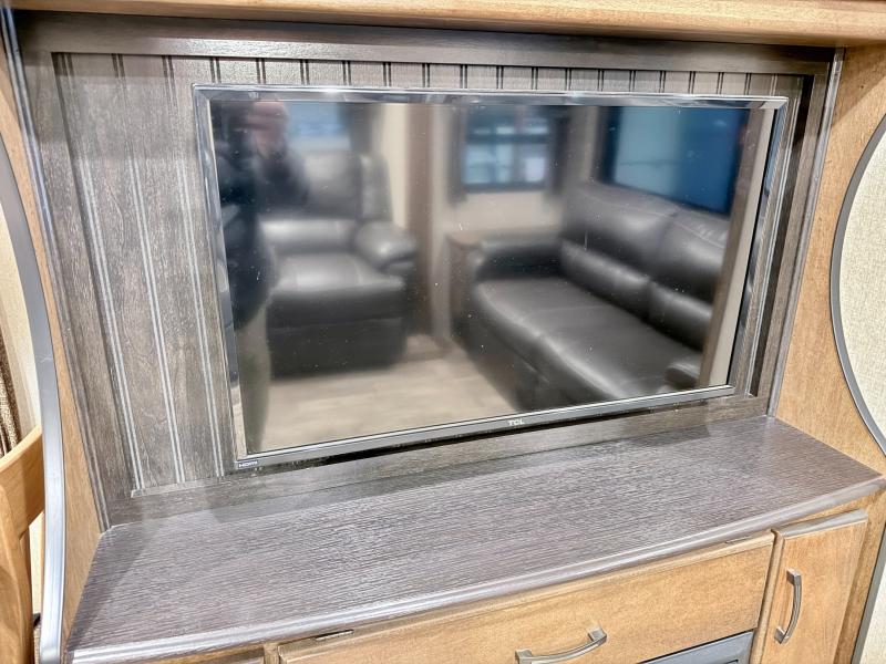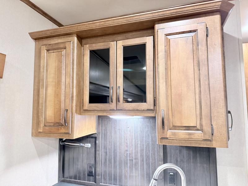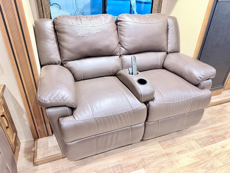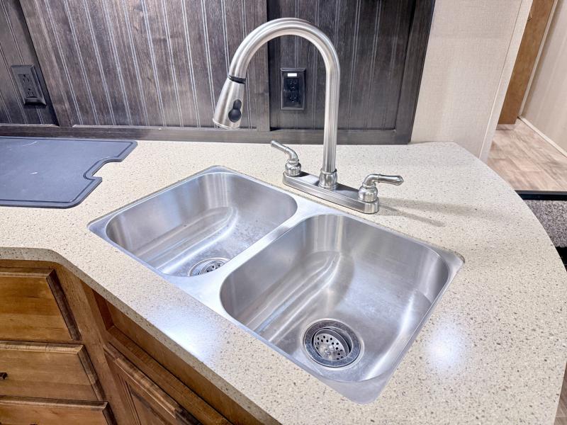 What I liked most: This rear living fifth wheel has a real open feel to it due to the opposing dual slides, one on the dining entertainment area the other in the living and the the kitchen galley area. The end tables in the living area have plenty of counter space as well as cabinet drawers. Plenty of cabinets above the couch in the theater seating as well as the television. Kitchen sink area is angled. Lots of cupboard space and wide deep drawers.