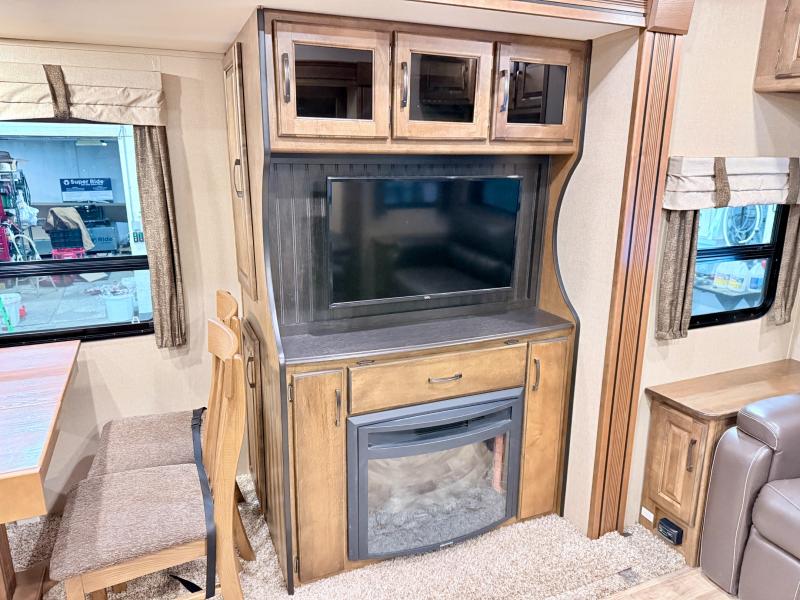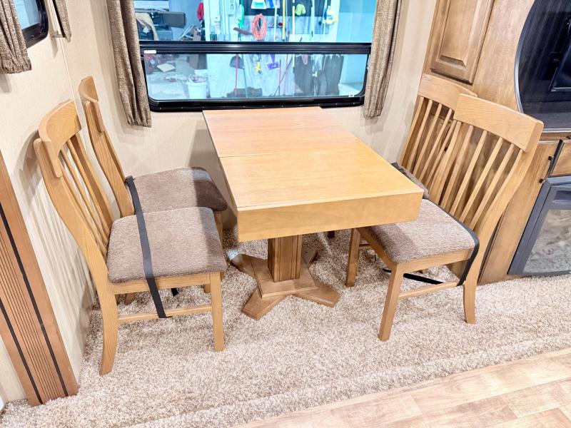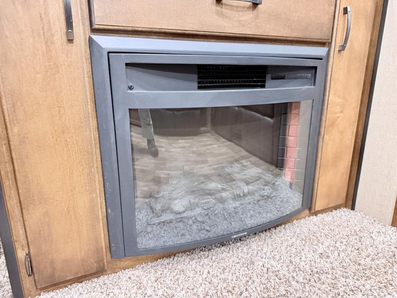 As you enter notice the spaciousness inside with dual opposing slide outs on either side of the unit. The slide to the left of the entry door features a booth dinette, or optional free standing dinette (pictured) along with an entertainment center and fireplace including overhead cabinets.