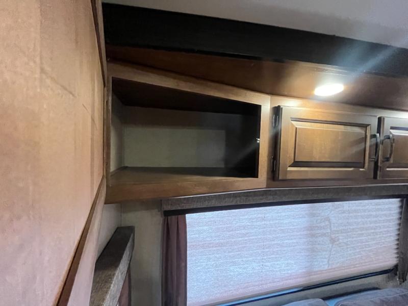 What I liked most: This rear living fifth wheel has a real open feel to it due to the opposing dual slides, one on the dining entertainment area the other in the living and the the kitchen galley area. The end tables in the living area have plenty of counter space as well as cabinet drawers. Plenty of cabinets above the couch in the theater seating as well as the television. Kitchen sink area is angled. Lots of cupboard space and wide deep drawers.