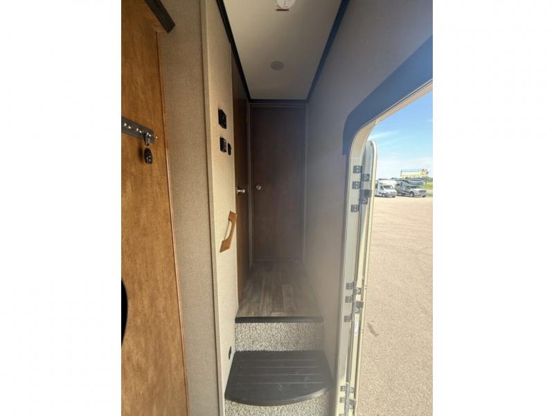 What I liked most: Illuminated outdoor speakers. Pass-thru storage in front is very large with liquid dirty tools plastic tray. Motion light in pass-through storage. Sturdy aluminum steps. Half-size outdoor kitchen with entertainment center.