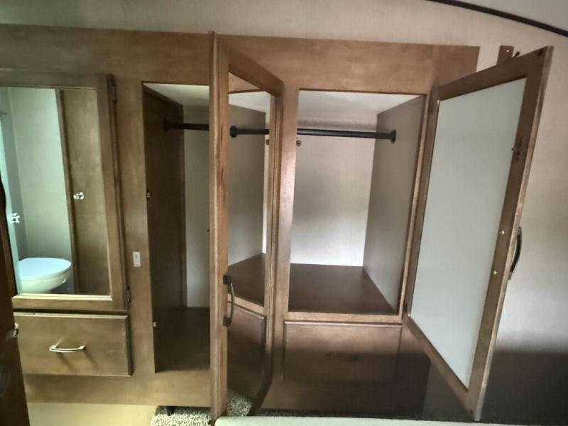 In the bedroom find a queen size bed, overhead cabinets on either side of the bed, plus above the head of the bed as well. There are also slide out wardrobes for your clothing, plus the linen cabinet that is accessible from within the bathroom.