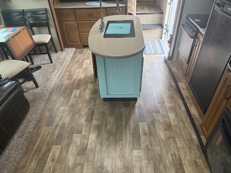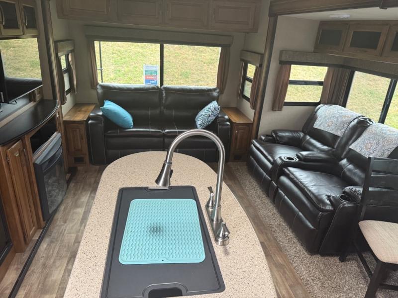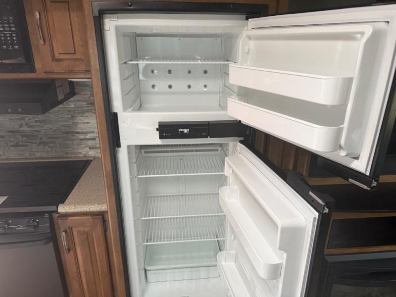 Back down on the main level find a kitchen area with countertop and overhead storage space along the interior living area wall. There is a convenient island with a large sink and counter prep space. The first slide out is along the entrance door wall including a three burner range with microwave above, a refrigerator, and an entertainment center with 32" TV plus a fireplace.