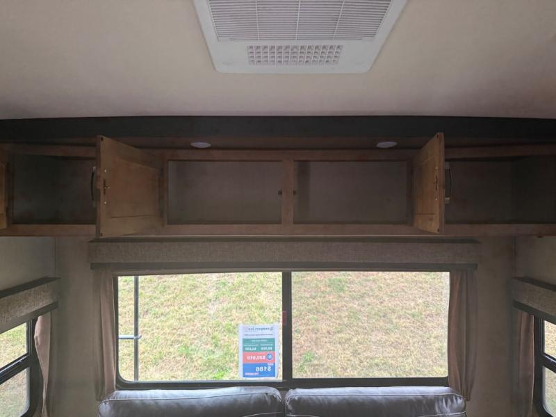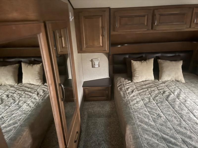 In the bedroom find a queen size bed, overhead cabinets on either side of the bed, plus above the head of the bed as well. There are also slide out wardrobes for your clothing, plus the linen cabinet that is accessible from within the bathroom.