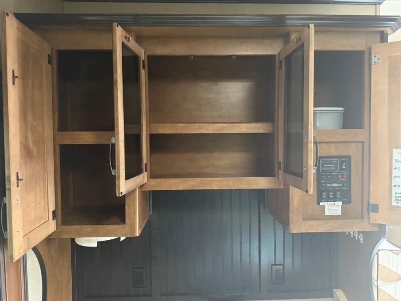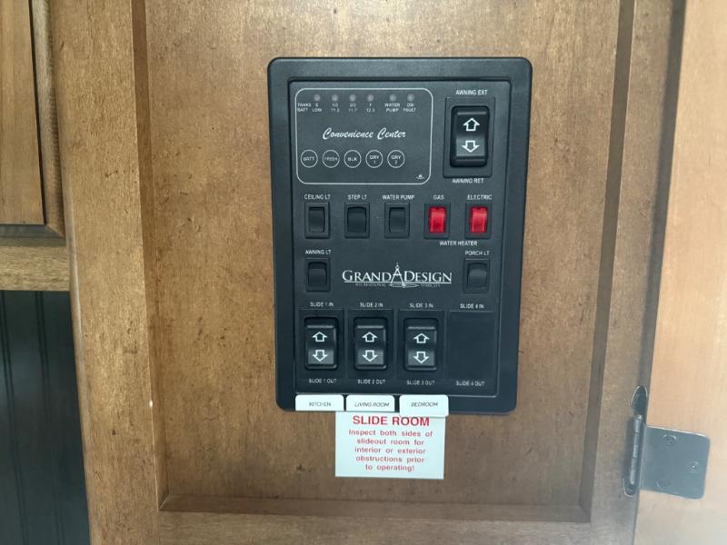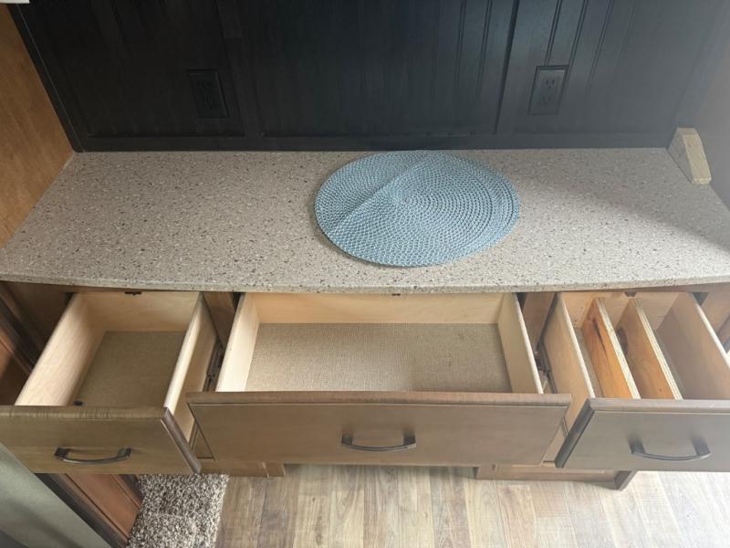What I liked most: Illuminated outdoor speakers. Pass-thru storage in front is very large with liquid dirty tools plastic tray. Motion light in pass-through storage. Sturdy aluminum steps. Half-size outdoor kitchen with entertainment center.