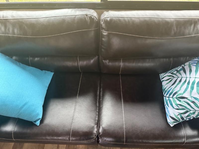 Across the rear wall of this Reflection unit you will enjoy a tri-fold hide-a-bed sofa with storage cabinets above to store more camping items. Adjacent, in the second living area slide out you will find theater seating for two and an optional free standing dinette instead of a booth dinette.