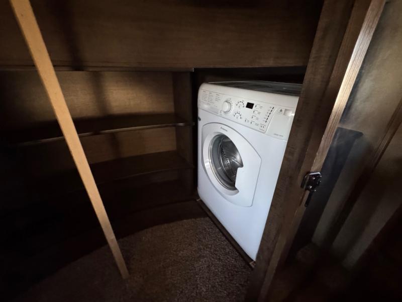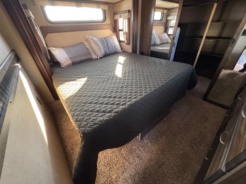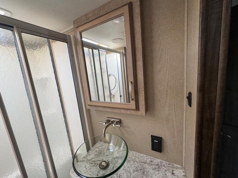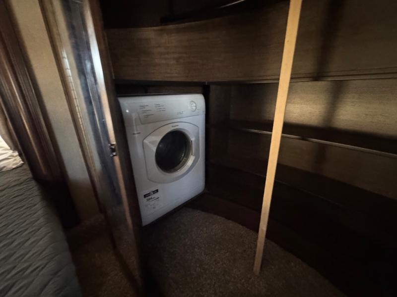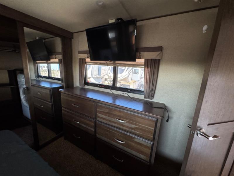 The front master bedroom features a queen or optional king bed slide with pull out ottoman at the foot of the bed. There is a dresser opposite along the curb side wall with an optional LED TV overhead. The very front features a spacious closet with washer and dryer prep on one end, plus so much more!