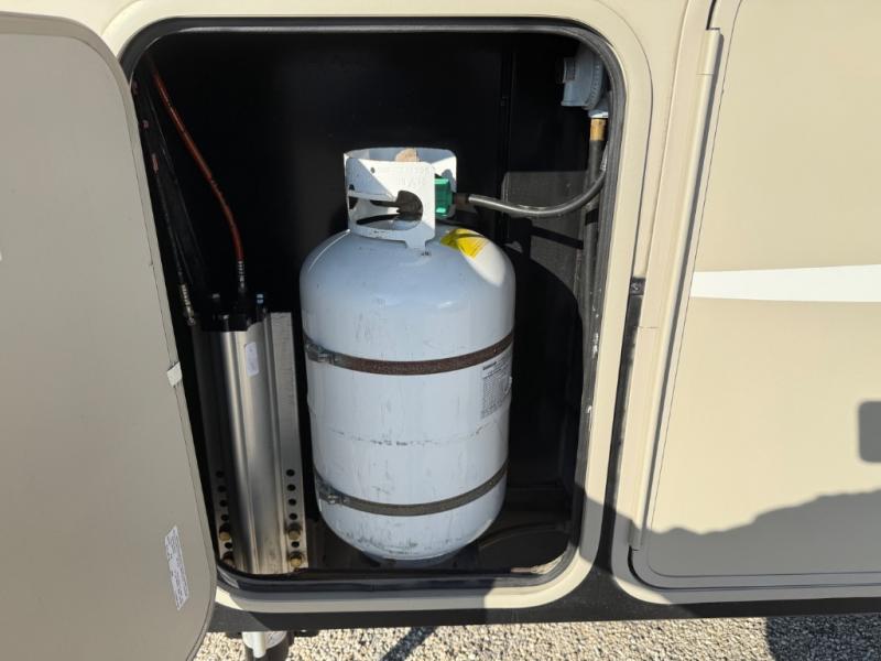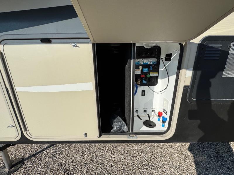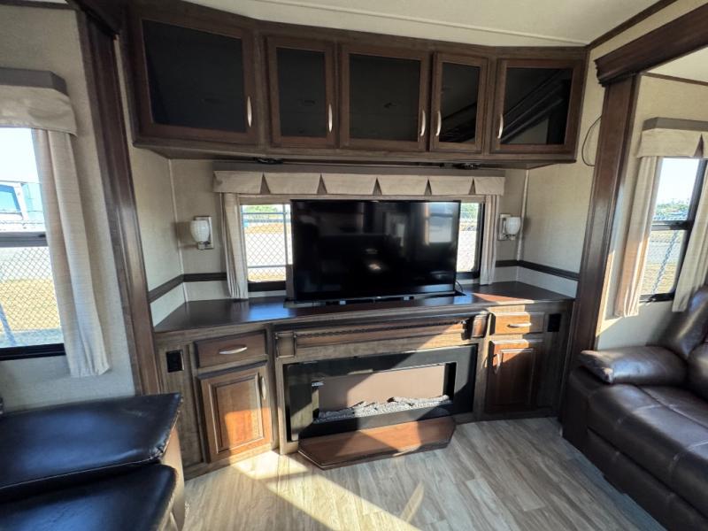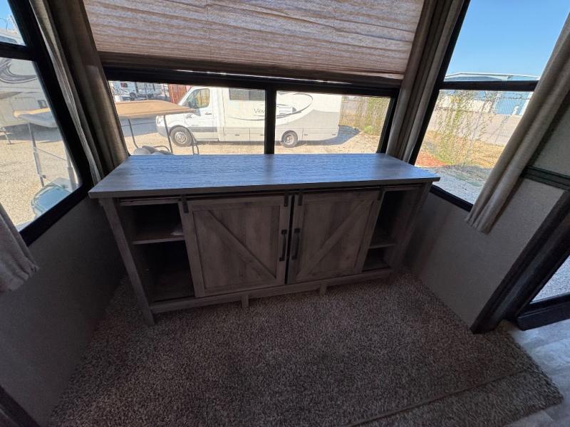 Step inside and see just how convenient future camping trips will be with all the space provided! The rear entertainment living area features a great place for everyone to congregate with a full wall entertainment center including an LED TV and fireplace. There are dual hide-a-bed sofa slide outs with one on either side, and theater seating for two facing the rear wall. There are also overhead cabinets for storage, plus an end table near the theater seats.
