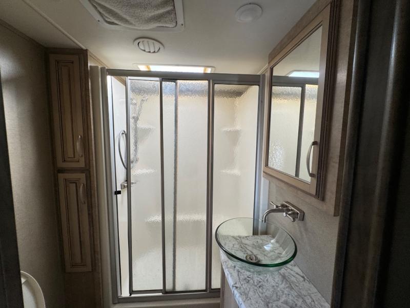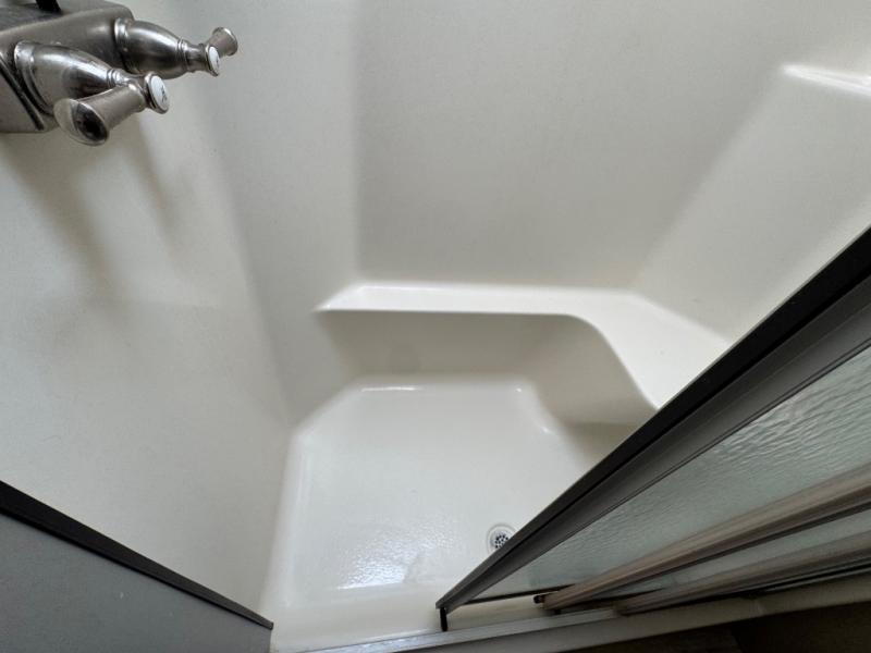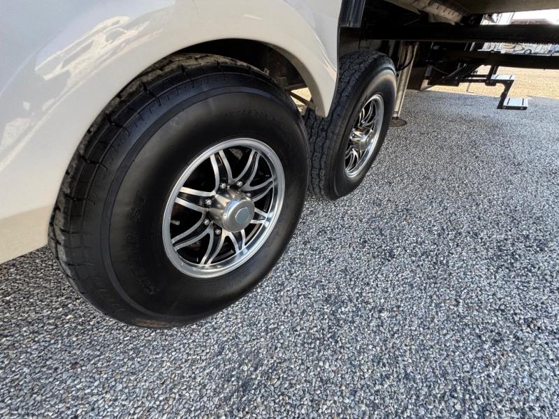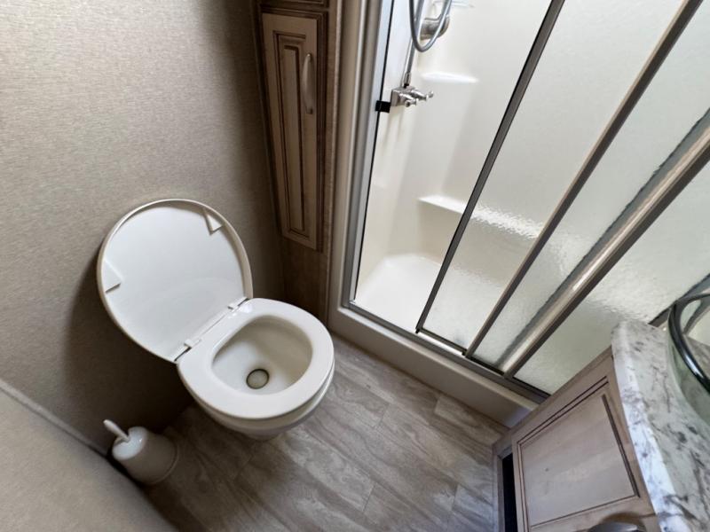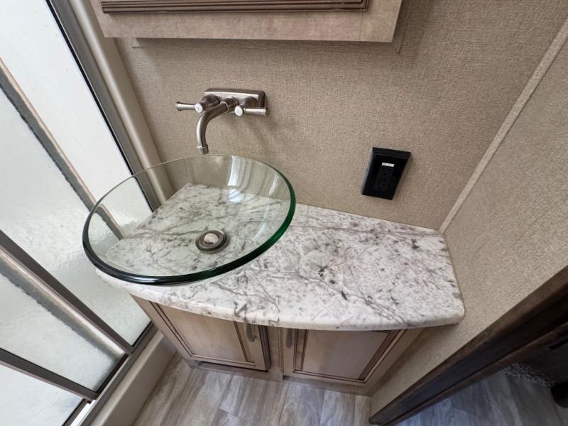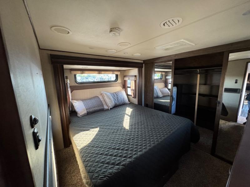 What I liked most: Two separate exterior awnings one for each exterior door entry. Sturdy aluminum steps. Six point stabilization. Rear steel bumper for extra stuff. One of the entries is a sliding double glass door. Quality in residential feel of the interior doors drawers and cabinetry. Tons of sitting in living area with two love seats and additional theater seating.