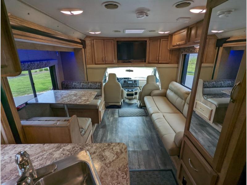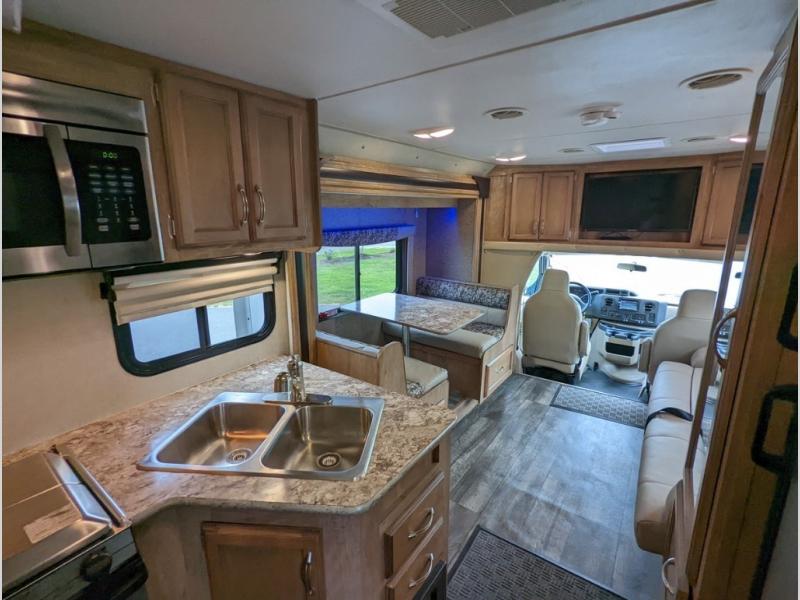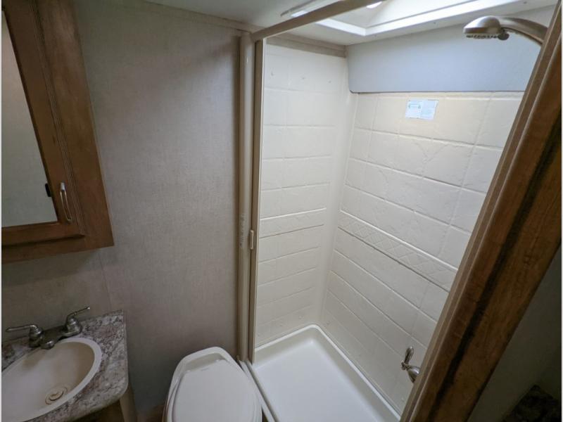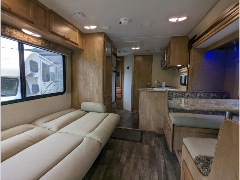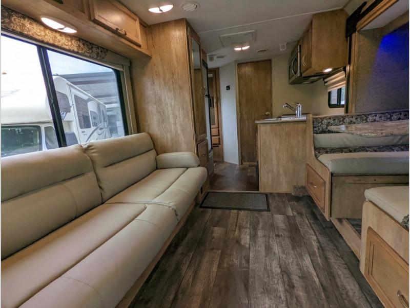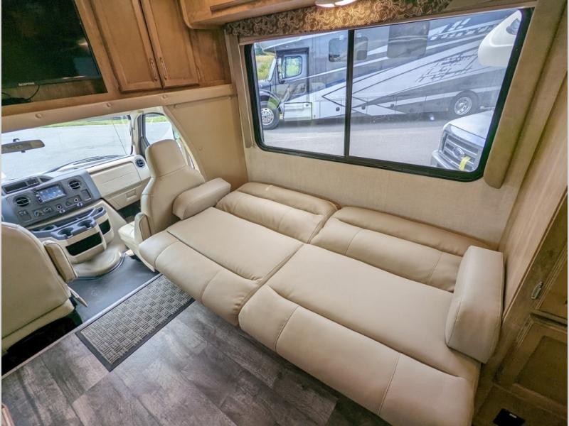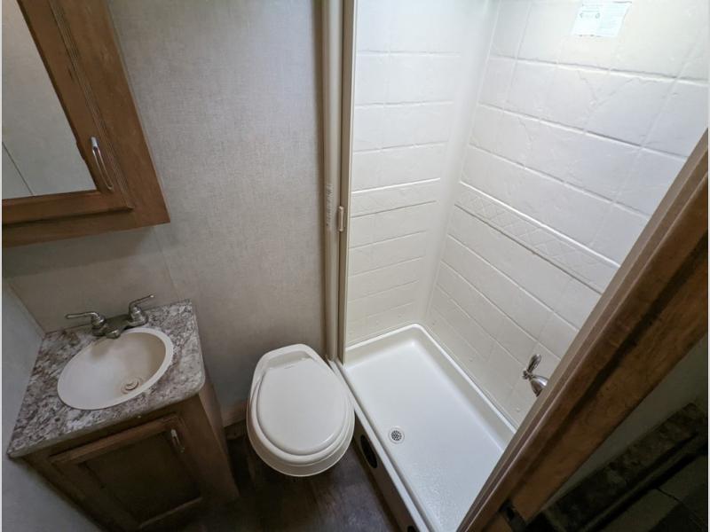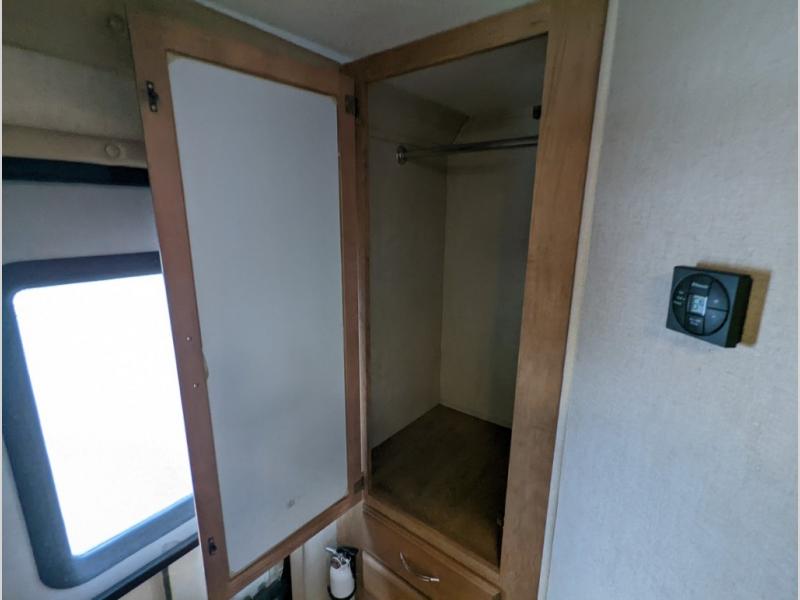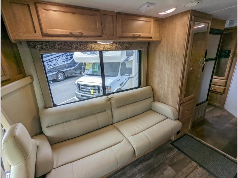 Step inside this class B+ motorhome and enjoy knowing that everything you need is ready for you as soon as you are parked. There is a wardrobe on your immediate left for clothing storage, or bath linens. A convenient bath is also located along the rear wall. Here you will find a tub/shower, toilet, and vanity sink.
